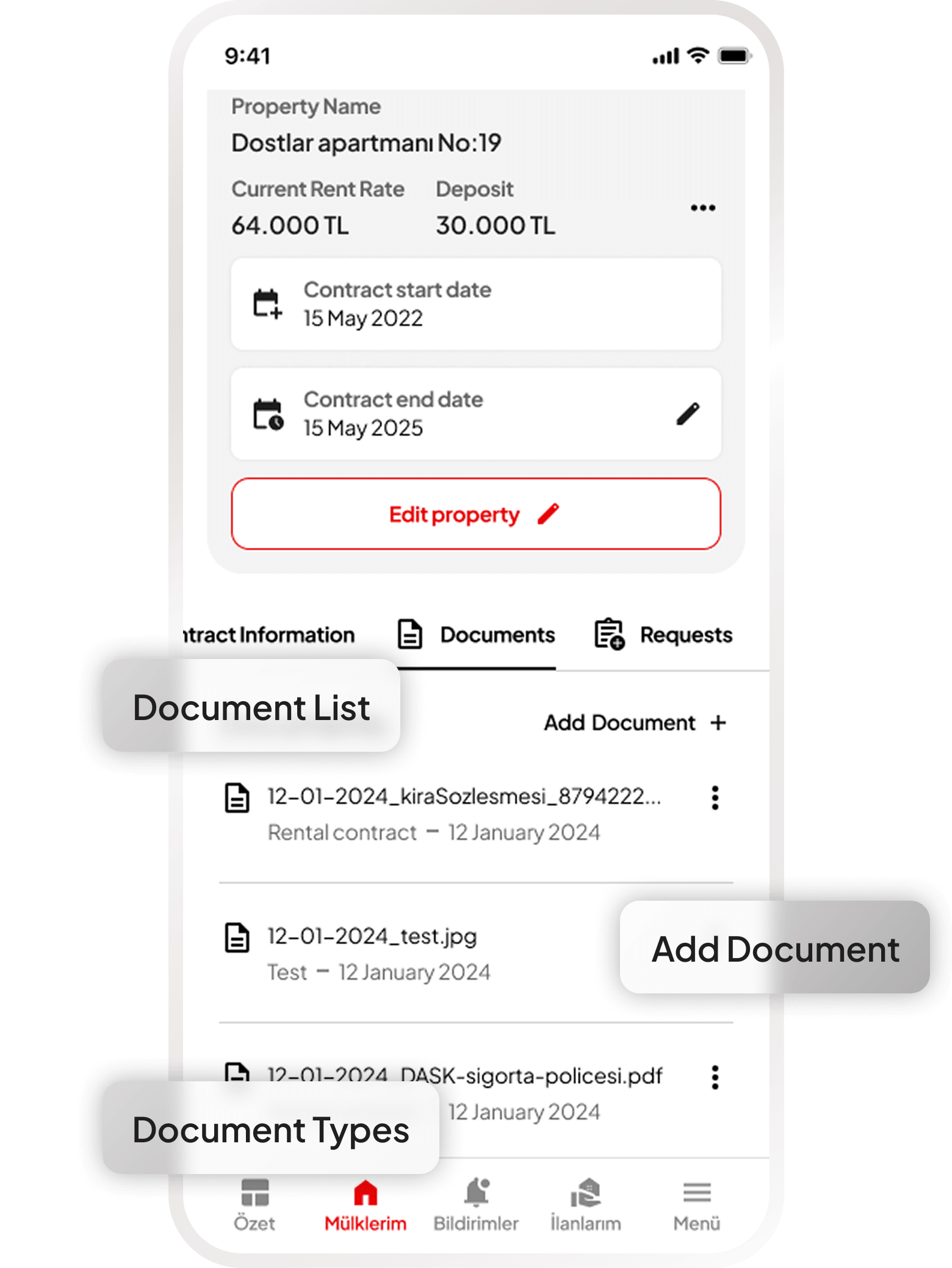 View all documents related to your property (rental agreement, title deed, invoices) in this section. Easily access and manage your documents.